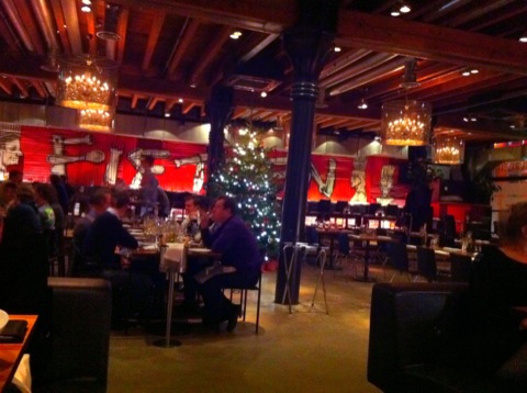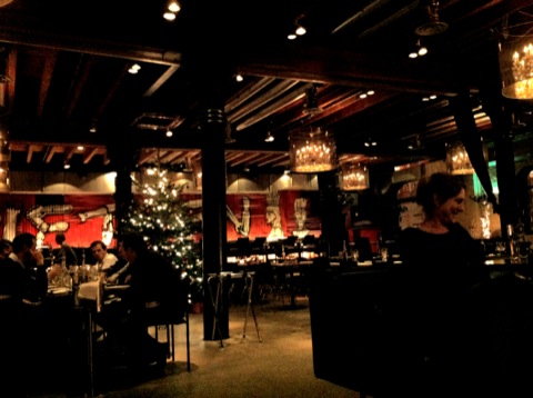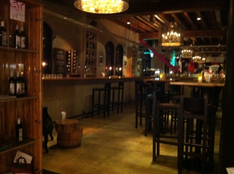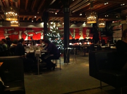 L’endroit est tout à fait à mon goût, un grand entrepôt avec une déco qui a conservé l’esprit de départ du lieu, des matériaux bruts, des graffiti sur de la tôle… Mais c’est confortable et la lumière tamisée donne une impression d’intimité bien agréable. Nous y sommes allés un lundi soir, sans réservation, il y avait un peu de monde, sans plus. On a été très bien accueilli et très heureux d’arriver, on avait rejoint l’endroit à pied… Et comment dire… La marche a été chouette, faite à un bon rythme de dingue et a eu de graves répercussions sur des muscles inconnus deux jours plus tard !