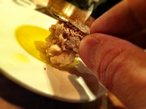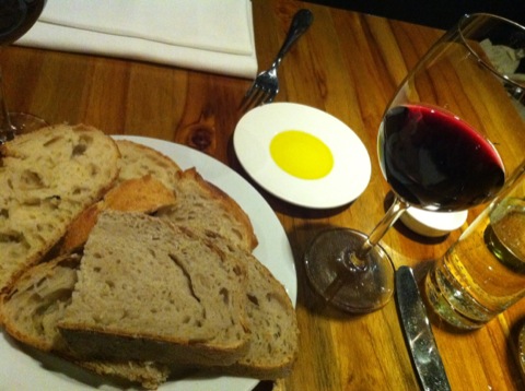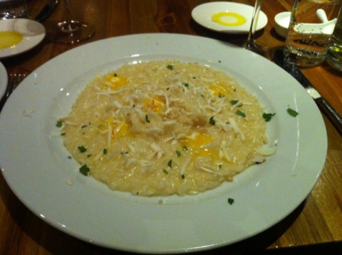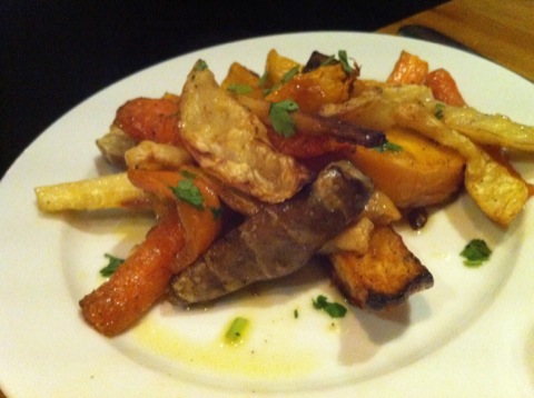 Pour accompagner le risotto et la raviole, nous avions commandé aussi des légumes rôtis qui étaient parfaits et une salade verte qui n’est jamais arrivée… Par contre, on a zappé le dessert, d’abord parce que ce n’est pas trop notre truc mais aussi un peu parce qu’on n’avait plus du tout faim (le pain et l’huile d’olive servis en apéritif y étaient-ils pour quelque chose ?)