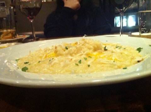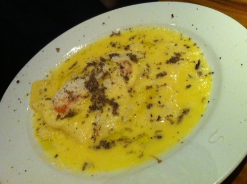 Mon partenaire a choisi un risotto tandis que mon choix se portait sur une raviole géante avec une sauce au beurre et à la truffe (depuis que j’ai vraiment goûté de la truffe au Coq-Gadby, je suis devenue dingue de ça malheureusement) ; dans la raviole était enfermé un oeuf sur le plat à la cuisson parfaite ! Loin d’être un exemple de légèreté, le plat était vraiment réussi et j’adore l’idée de l’oeuf dans une raviole ! Du côté du risotto, aucun reproche non plus à formuler…