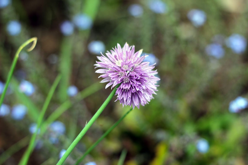 Il se passe des trucs moches dans mon potager (des fraises grignotées, de la terre détrempée…) mais j’aime bien les fleurs de ciboulette qui poussent au milieu des aromatiques et du myosotis…